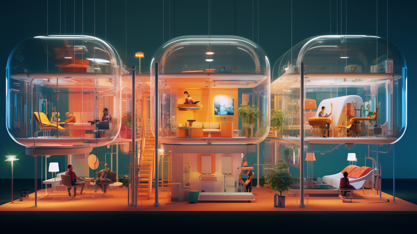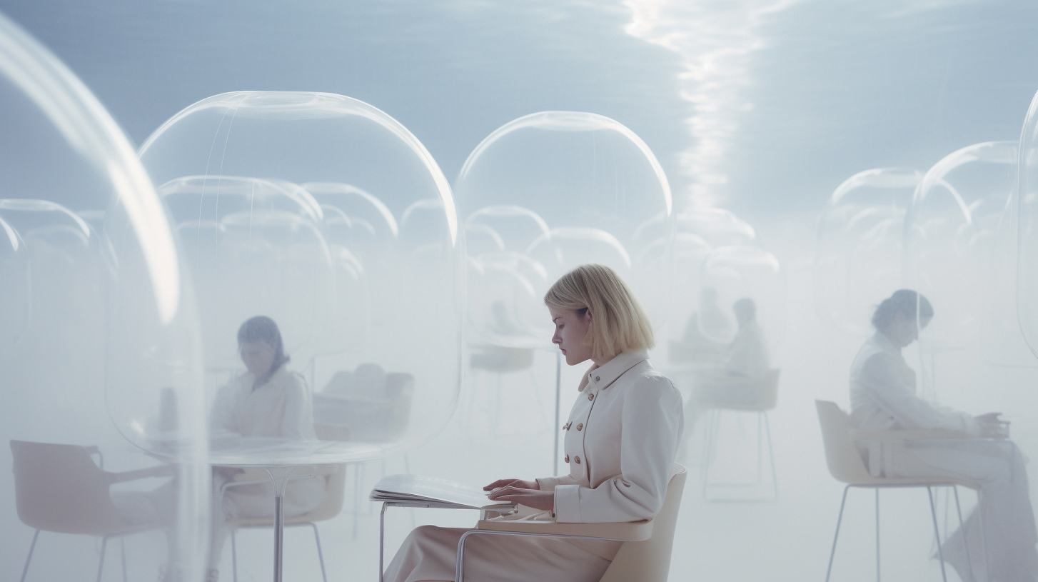 TextToImg-AI-Anwendungen erzeugen Bilder in anderer als der uns gewohnten Weise. Die hier zu sehenden Bilder wurden durch solche prompts erzeugt: tiny co working space, white, translucent ,inflatable, transparent, playful, interior:: foggy cloudy misty, lego, space station, james turell style, diverse people --ar 16:9. Wir können nicht genau sagen, welches Wort in dieser Wortreihe welchen Einfluss auf das generierte Bild hat. Diese kurze Versuchsreihe versucht sich dem im Rahmen eines typischen innenarchitektonischen Themas anzunähern.
