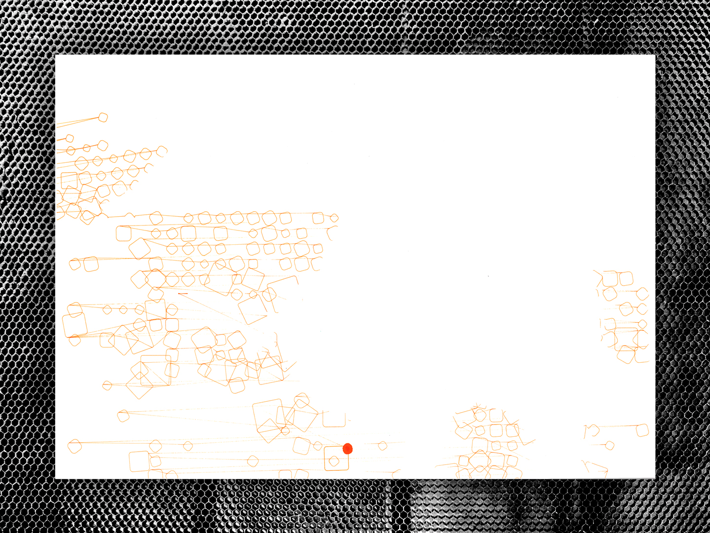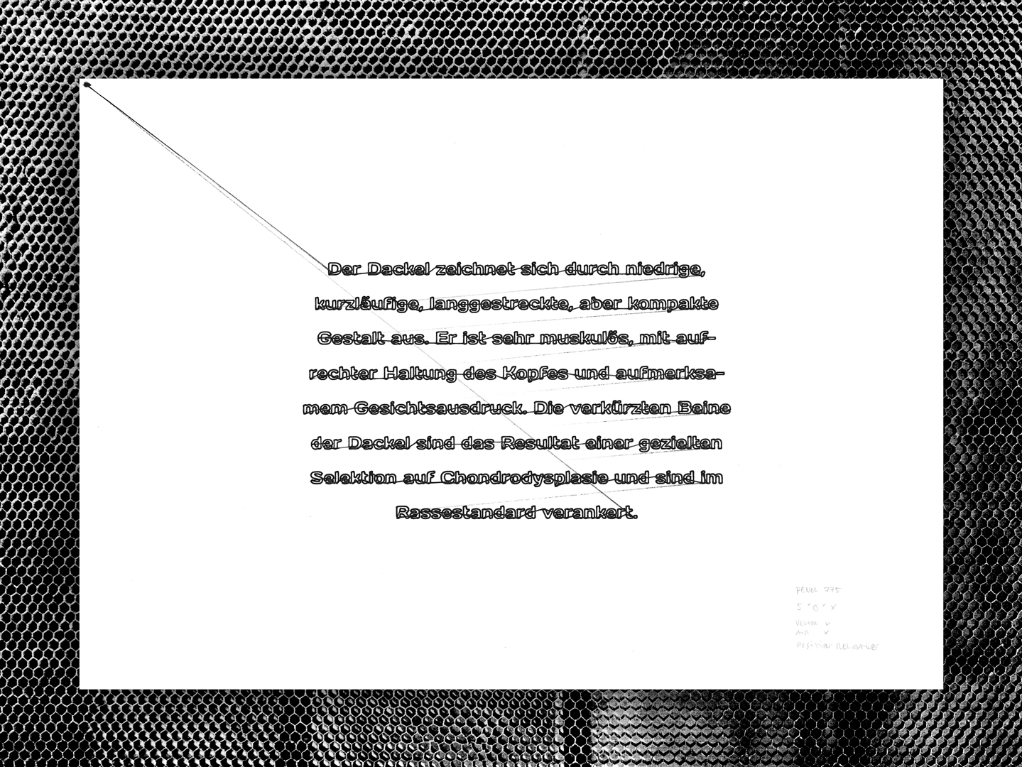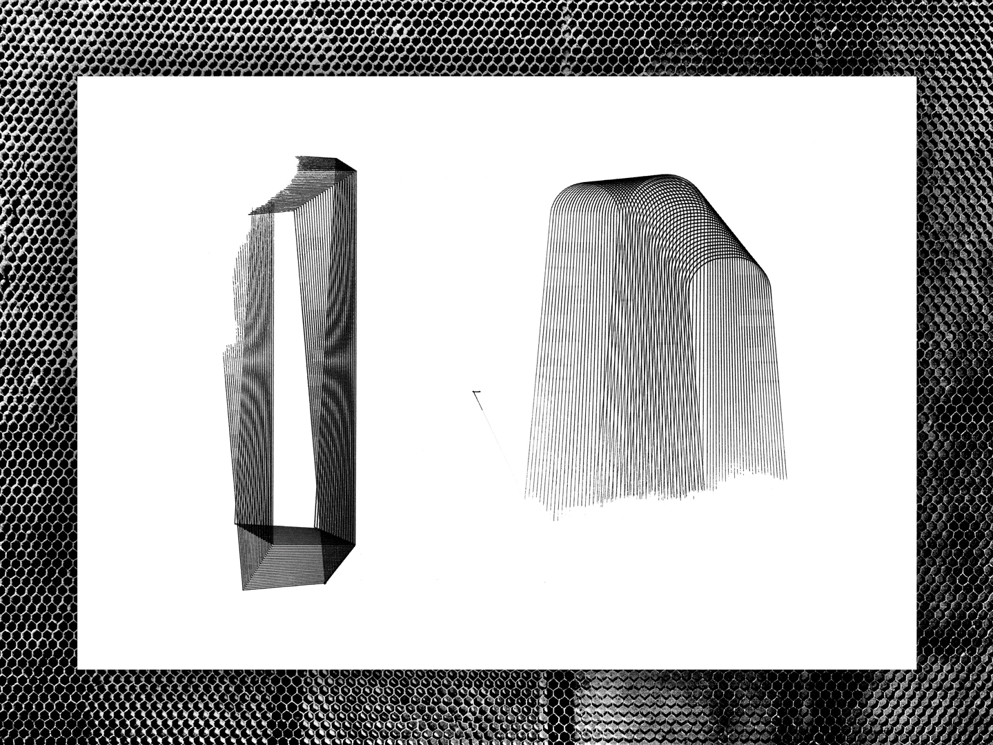 Der CNC-Laser wurde mit Hilfe eines 3D-gedruckten Stifthalters zu einem Drucker. Die Kombination aus Vektor- und Rasterlaserung mit dem Stift auf Transparentpapier ergibt dabei eine neue Ästhetik, welche durch konventionelle Druckverfahren nicht möglich sind.